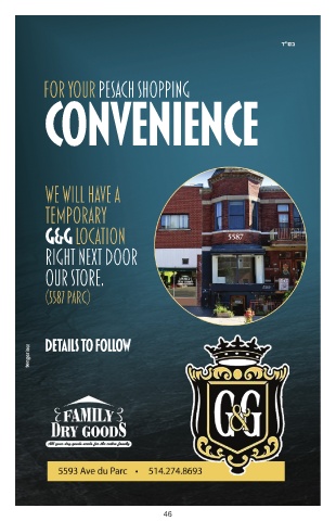 FOR YOUR PESACH SHOPPING CONVENIENCE WE WILL HAVE A TEMPORARY G&G LOCATION 5587 RIGHT NEXT DOOR OUR STORE. (5587 PARC) DETAILS TO FOLLOW 46
