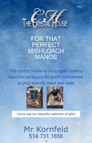 FOR THAT PERFECT MISHLOACH MANOS The crystal house is once again making beautiful packages for purim customized to your specific need and taste Come see our beautiful selection of gifts! Mr Kornfeld 514.731.1656 70