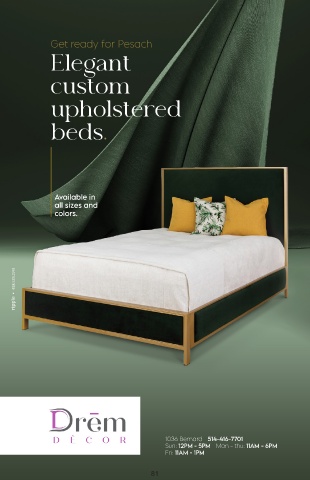 Get ready for Pesach Elegant custom upholstered beds. Available in all sizes and colors. 1036 Bernard 514-416-7701 Sun: 12PM - 5PM Mon - thu: 11AM - 6PM Fri: 11AM - 1PM 81