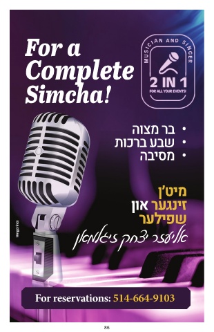 For a Complete Simcha! הוצמ רב תוכרב עבש הביסמ ן׳טימ ןוא רעגניז רעליפש ןאמלגיז קחצי רזעילא For reservations: 514-664-9103 86