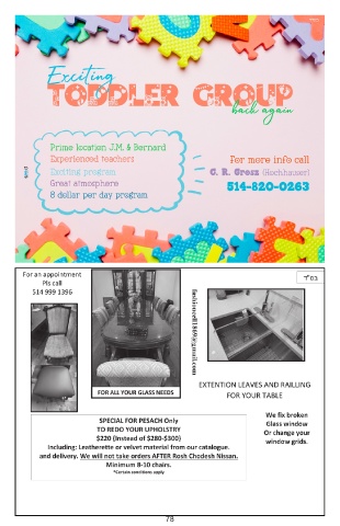 Exciting E x c i t i n g TODDLER GROUP back again Prime location J.M. & Bernard Experienced teachers For more info call Exciting program C. R. Grosz (Hochhauser) Great atmosphere 514-820-0263 8 dollar per day program 78