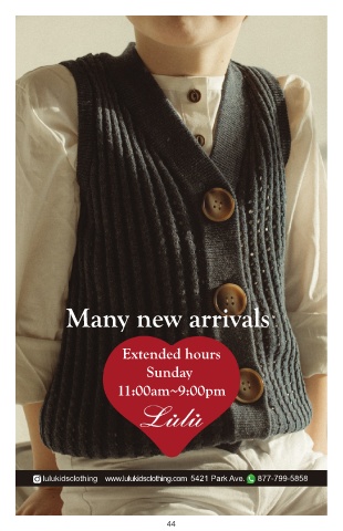 Many new arrivals Extended hours Sunday 11:00am~9:00pm lulukidsclothing www.lulukidsclothing.com 5421 Park Ave. 877-799-5858 44