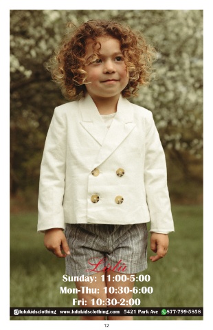 Sunday: 11:00-5:00 Mon-Thu: 10:30-6:00 Fri: 10:30-2:00 lulukidsclothing www.lulukidsclothing.com 5421 Park Ave 877-799-5858 12