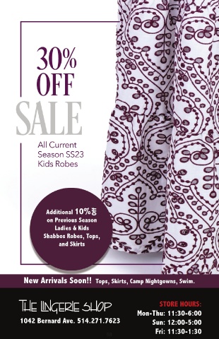 Additional 10%12 Off on Previous Season Ladies & Kids Shabbos Robes, Tops, and Skirts New Arrivals Soon!! Tops, Skirts, Camp Nightgowns, Swim. STORE HOURS: Mon-Thu: 11:30-6:00 1042 Bernard Ave. 514.271.7623 Sun: 12:00-5:00 Fri: 11:30-1:30 58