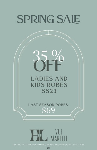 SPRING SALE 35 % OFF LADIES AND KIDS ROBES SS23 LAST SEASON ROBES: $69 Sun.-12:00 - 5:00 / Mon. Thur.-11:00-5:00 / Fri. -11:00-1:00 / 5668 Parc Ave. / 514-272-4288 20