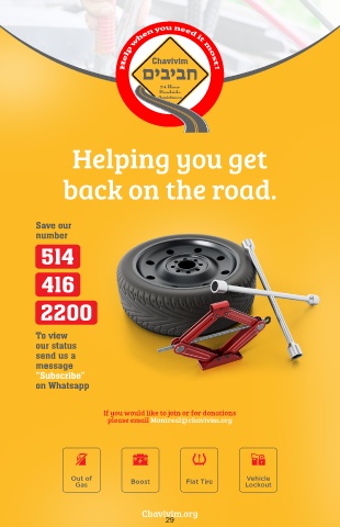 Chavivim םיביבח 24 Hour Roadside Assistance Helping you get back on the road. Save our number To view our status send us a message "Subscribe" on Whatsapp If you would like to join or for donations please email Montreal@chavivim.org Chavivim.org 29