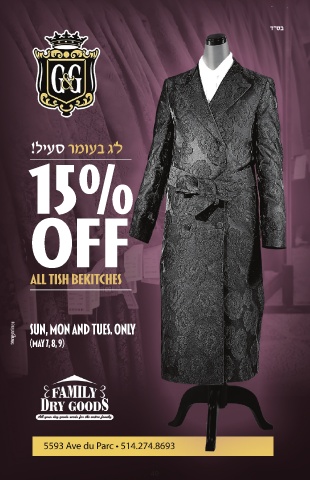 !ליעס רמועב ג״ל 15% OFF ALL TISH BEKITCHES SUN, MON AND TUES. ONLY (MAY 7, 8, 9) 40