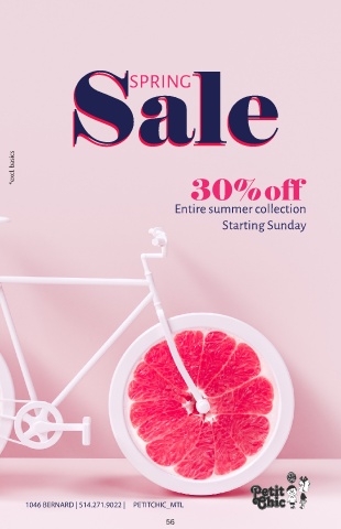 Sale Sale SPRING *excl. basics 30% off Entire summer collection Starting Sunday 1046 BERNARD | 514.271.9022 | PETITCHIC_MTL 56