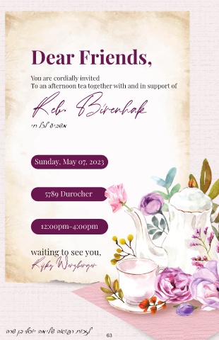 Dear Friends, You are cordially invited To an afternoon tea together with and in support of Reb. Birenhak יח לכל עיבשמ Sunday, May 07, 2023 5789 Durocher 12:00pm-4:00pm waiting to see you, Rifky Werzberger הרש ןב ףסוי המילש האופר תוכזל 63