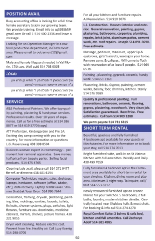 Shabbosdige gartel on St Viateur bet J. mance POSITION AVAIL For all your kitchen and furniture repairs.