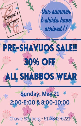 Our summer t-shirts have arrived!! P R E - S H A V U O S S A L E ! ! PRE-SHAVUOS SALE!! 3 0 % O F 30% OFFF O ALL SHABBOS WEARR B A E A W S H L S L B A Sunday, May 21 2:00-5:00 & 8:00-10:00 Chavie Salzberg - 514-342-6221 100