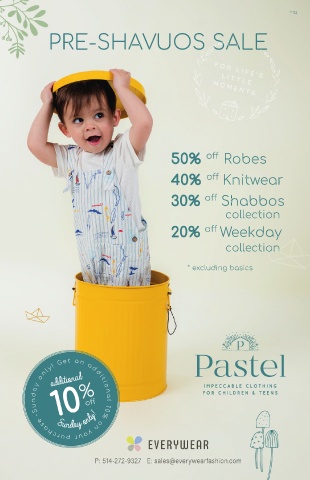PRE-SHAVUOS SALE 50% Robes 40% Knitwear 30% Shabbos collection 20% Weekday collection * excluding basics additional 10 % Sunday only! - S u n d a y o n l y ! G e t a n a d d i t i o n a l 1 0 % o n y o u r p u r c h a s e