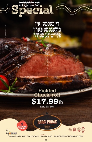 ןיא עטסעב יד ן'ראפ עטסגעליב הדועס עגישיילפ Pickled Chuck roll $17.99lb Reg 22.49lb Call/Text 6680 PARK AVE 514.279.3663 514.274.5200 PRIME@FOODERIEMARKET.COM 59