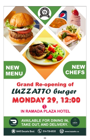 NEW NEW MENU CHEFS Grand Re-opening of b T T O e r g u r A Z U L LUZZATTO burger Z Monday 29, 12:00 IN RAMADA PLAZA HOTEL AVAILABLE FOR DINING IN, TAKE OUT, AND DELIVERY. UBER DOORDASH E A T S 6445 Decarie Boul. 514-739-8535 www.luzzatto.ca 88