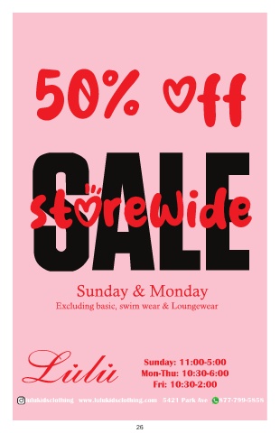 storewide Sunday & Monday Excluding basic, swim wear & Loungewear Sunday: 11:00-5:00 Mon-Thu: 10:30-6:00 Fri: 10:30-2:00 lulukidsclothing www.lulukidsclothing.com 5421 Park Ave 877-799-5858 26