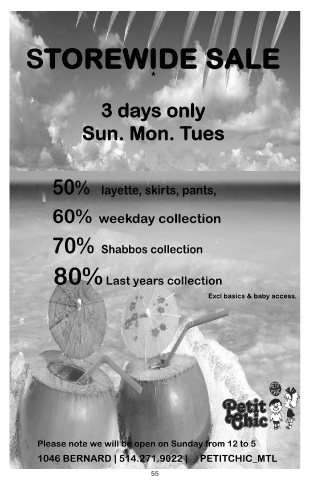 50% layette, skirts, pants, 60% weekday collection 70% Shabbos collection 80% Last years collection Excl basics & baby access. Please note we will be open on Sunday from 12 to 5 1046 BERNARD | 514.271.9022 | PETITCHIC_MTL 55
