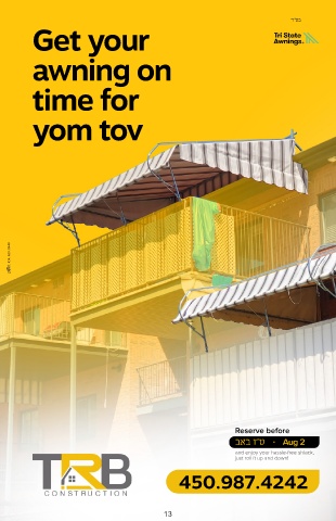 Get your ד''סב awning on time for yom tov nt 514. 612. 8440 p Reserve before באב ו"ט • Aug 2 and enjoy your hassle-free shlack, just roll it up and down! 450.987.4242 CONSTR UCTION 13