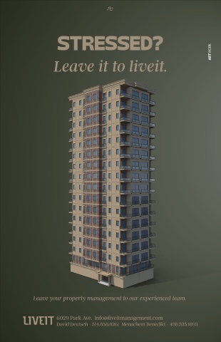 בס״ד STRESSED? ART WORK Leave it to liveit. Leave your property management to our experienced team. 6029 Park Ave, Info@liveitmanagement.com David Deutsch - 514.838.8261 Menachem Benedikt - 438.525.1893