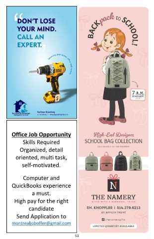 Office Job Opportunity Skills Required Organized, detail oriented, multi task, self-motivated. Computer and QuickBooks experience a must. High pay for the right candidate Send Application to montrealjoboffer@gmail.com 53