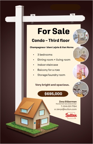 For Sale Condo – Third floor Champagneur btwn Lajoie & Van Horne • 3 bedrooms • Dining room + living room • Indoor staircase • Balcony for a הכוס • Storage/laundry room Very bright and spacious. $695,000 46