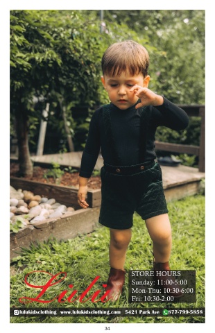 STORE HOURS Sunday: 11:00-5:00 Mon-Thu: 10:30-6:00 Fri: 10:30-2:00 lulukidsclothing www.lulukidsclothing.com 5421 Park Ave 877-799-5858 34