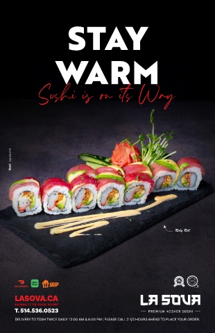 STAY WARM Sushi is on its Way Kool 514.501.2178 Ruby Roll LASOVA.CA BRINGS IT TO YOUR DOOR! T. 514.536.0523 DELIVERY TO TOSH TWICE DAILY: 12:00 AM & 6:00 PM | PLEASE CALL 2 1/2 HOURS AHEAD TO PLACE YOUR ORDER. 17