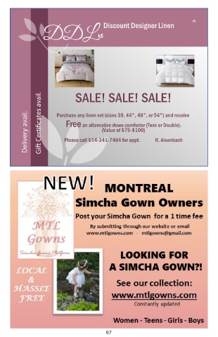 Discount Designer Linen B’H SALE! SALE! SALE! Delivery avail. Purchase any linen set (sizes 39, 44", 48", or 54") and receive Free an alternative down comforter (Twin or Double). (Value of $75-$100) Please call 514-341-7484 for appt. R. Aisenbach 67