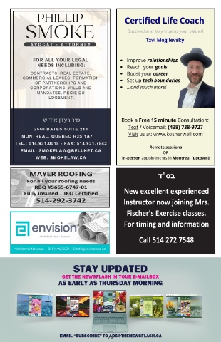 MAYER ROOFING ד"סב For all your roofing needs RBQ #5665-6747-01 Fully insured | IKO Certified New excellent experienced 514-292-3742 Instructor now joining Mrs. Fischer’s Exercise classes. For timing and information Call 514 272 7548 72