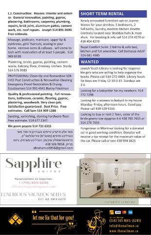 Whoever did not return the Beis Hamikdosh work, etc. roof repairs. Joseph 514 891-3690. full baths, laundry, modern kitchen dinette.