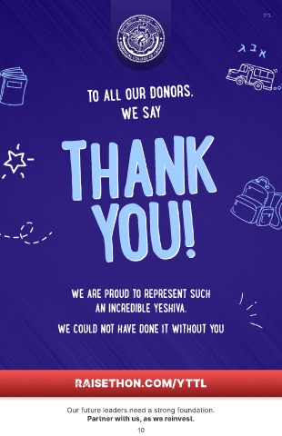 ה"ב TO ALL OUR DONORS, WE SAY THANK YOU! WE ARE PROUD TO REPRESENT SUCH AN INCREDIBLE YESHIVA. WE COULD NOT HAVE DONE IT WITHOUT YOU RAISETHON.COM/YTTL Our future leaders need a strong foundation. Partner with us, as we reinvest. 10