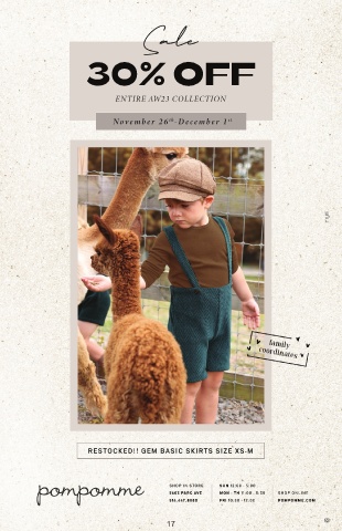 Sale 30% OFF family coordinates RESTOCKED!! GEM BASIC SKIRTS SIZE XS-M SHOP IN STORE SUN 12:00 - 5:00 5603 PARC AVE MON - TH 11:00 - 5:30 SHOP ONLINE 514.447.8880 FRI 10:30 - 12:00 POMPOMME.COM 17