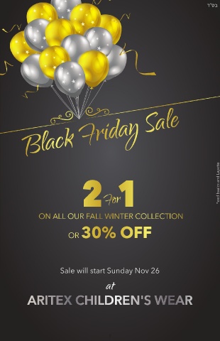 ד”סב Black Friday Sale 2 1 *excl basics and Layette For ON ALL OUR FALL WINTER COLLECTION OR 30% OFF Sale will start Sunday Nov 26 at ARITEX CHILDREN'S WEAR 7 5425 Casgrain #602 514 271 1461
