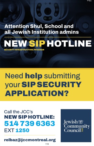 Attention Shul, School and all Jewish Institution admins NEW SIP HOTLINE SECURITY INFRASTRUCTURE PROGRAM Need help submitting your SIP SECURITY APPLICATION? Call the JCC’s NEW SIP HOTLINE: 514 739 6363 EXT 1250 relbaz@jccmontreal.org 119