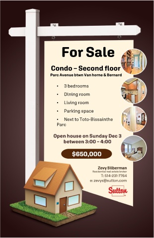 For Sale Condo – Second floor Parc Avenue btwn Van horne & Bernard • 3 bedrooms • Dining room • Living room • Parking space • Next to Toto-Bissainthe Parc Open house on Sunday Dec 3 between 3:00 – 4:00 $650,000 84