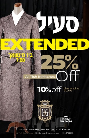 ד"סב ליעס EXTENDED ךאווטימ זיב 7:00 25% Off All Tish Bekitches 10%off the entire store Sun-Thu 2pm-6:15pm Wed 2pm-7pm Fri 10:30am-1pm ןופ ץראה יד ןיא Outremont 1105 Bernard (Corner Querbes) • 514.274.8693 10