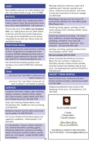 ah, Chany Stern: 514 544 3037 Part time female secretary position avail. Mance for your simchos. 5 bedrooms, 2