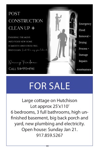 FOR SALE Large cottage on Hutchison Lot approx 25’x110’ 6 bedrooms, 3 full bathrooms, high un- nished basement, big back porch and yard, new plumbing and electricity. Open house: Sunday Jan 21. 917.859.5267 80