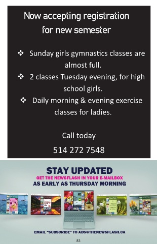 ד סב Now accepting registration for new semester Sunday girls gymnas�cs classes are almost full. 2 classes Tuesday evening, for high school girls. Daily morning & evening exercise classes for ladies. Call today 514 272 7548 83