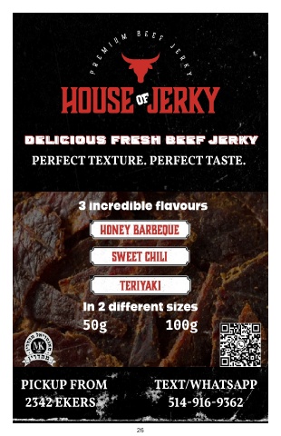 delicious fresh beef jerky PERFECT TEXTURE. PERFECT TASTE. 3 incredible flavours In 2 different sizes 50g 100g PICKUP FROM TEXT/WHATSAPP T /WHA T EX SAPP T 2342 EKERS 514-916-9362 514-916-9362 514-916-9362 26