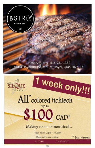 l A All colored tichlech l * i t r e d e c h c h l l o c o up to 1 0 0 A C $ $100 CAD! D Making room for new stock… Open daily 8:00pm – 10:00pm Please call before coming. * Excl. Hermes R. POSEN 514 279 8787 78