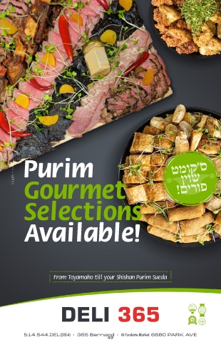 Purim טמוק'ס ןיוש Gourmet !םירופ Selections Available! From Toyamaho till your Shishan Purim Sueda 514.544.DELI(3354) • 365 Bernard • At Fooderie Market 6680 PARK AVE 49