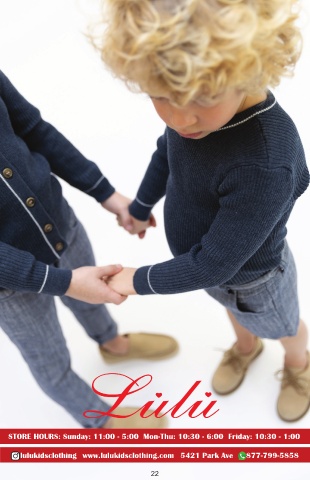 STORE HOURS: Sunday: 11:00 - 5:00 Mon-Thu: 10:30 - 6:00 Friday: 10:30 - 1:00 lulukidsclothing www.lulukidsclothing.com 5421 Park Ave 877-799-5858 22