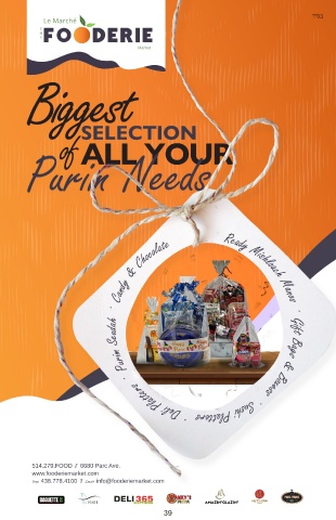 ד”סב ד"סב Ready Mishloach Manos ˙ Gift Bags & Boxess ˙ Sushi Platters ˙ Deli Platters ˙ Purim Seudah ˙ Candy & Chocolate 514.279.FOOD II 6680 Parc Ave. www.fooderiemarket.com Text: 438.778.4100 II Email: info@fooderiemarket.com 39