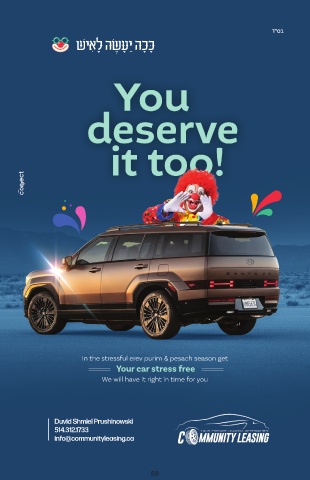 " In the stressful erev purim & pesach season get Your car stress free We will have it right in time for you Duvid Shmiel Prushinowski 514.312.1733 info@communityleasing.ca 59