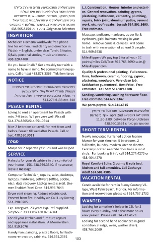 mer Shabbat Yossi Oron 514.996.7644 lage, West Palm Beach, Florida. For informa-