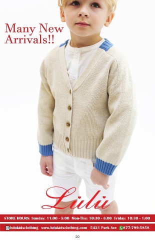 Many New Arrivals!! STORE HOURS: Sunday: 11:00 - 5:00 Mon-Thu: 10:30 - 6:00 Friday: 10:30 - 1:00 lulukidsclothing www.lulukidsclothing.com 5421 Park Ave 877-799-5858 20