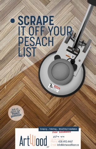 • SCRAPE IT OFF YOUR PESACH LIST Ask us about our Pesach promotion Scraping • Polishing • Wood/Vinyl Installation Free Estimates שטייד דוד Call, Text, WhatsApp Phone: 438.493.4467 Email: Info@Artwoodfloor.ca 47