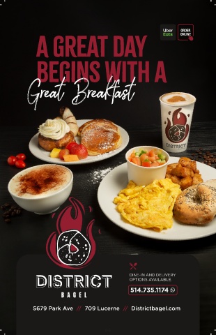 A great day ORDER ONLINE begins with a Great Breakfast DINE-IN AND DELIVERY OPTIONS AVAILABLE. 514.735.1174 5679 Park Ave // 709 Lucerne // Districtbagel.com 69