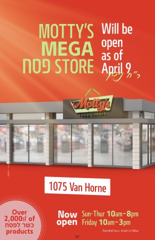 MOTTY'S Will be MEGA open as of חספ STORE April 9 ןסינ ח"ר 1075 Van Horne Over Now Sun-Thur 10am-8pm 2,000sf of חספל רשכ open Friday 10am-3pm products Extended hours. details to follow 87