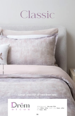 Classic Large selection of bed linen sets 1036 Bernard 514-416-7701 Sun: 12PM - 5PM Mon - thu: 11AM - 6PM Fri: 11AM - 1PM 95